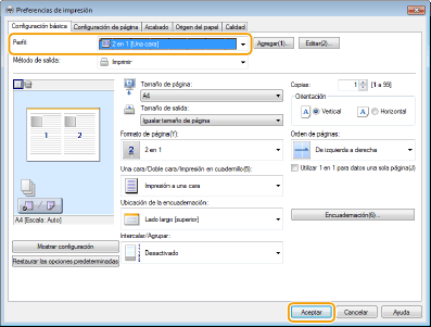 Haga clic en la pestaña [Configuración básica], [Configuración de página], [Acabado], [Origen del papel] o [Calidad] para especificar las opciones de impresión en cada pantalla según sea necesario. Varias opciones de impresión