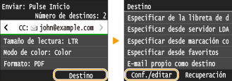 Puede seleccionar un destino entre los tres últimos destinos utilizados. Cuando se especifica un destino utilizado anteriormente, el equipo también configura las mismas opciones de lectura utilizadas la última vez que se enviaron documentos a dicho destino como, por ejemplo, la densidad.