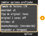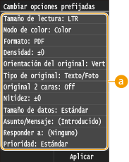 <Menú>  <Opciones de lectura>  <Opciones de e-mail>  <Cambiar opciones prefijadas>  Seleccione la opción  Cambie el valor predeterminado del elemento seleccionado  <Aplicar>