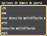 Los puertos sirven como extremos para establecer la comunicación con otros dispositivos. Normalmente, los números de puerto convencionales se utilizan para los principales protocolos, pero los dispositivos que utilizan estos números de puerto son vulnerables a ataques debido a que estos números de puerto son muy conocidos. Para mejorar la seguridad, el administrador de red puede cambiar los números de puerto. Cuando se modifica un número de puerto, el nuevo número debe compartirse con los dispositivos de comunicación, como es el caso de los ordenadores y los servidores. Especifique las opciones del número de puerto en función de su entorno de red.