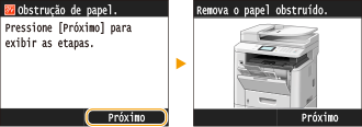 Se ocorrer um atolamento de papel, <Obstrução de papel.> será exibido na tela. Toque em <Próximo> para exibir soluções simples*. Se for difícil entender os procedimentos no visor, consulte as seções a seguir para eliminar os atolamentos.