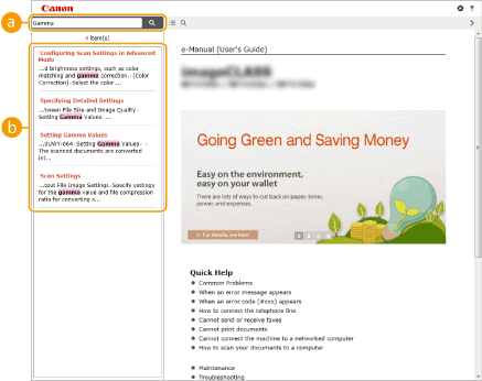 Click to display information on how to view the e-Manual, how to perform a search, and other information.