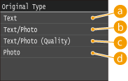 You can select the optical image quality for the copy depending on the document type, such as text-only documents, documents with charts and graphs, or magazine photos.