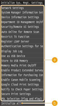 <Menu>  <System Management Settings>  <Initialize Menu>  Select the item you want to initialize  <Yes>    Restart the machine if necessary
