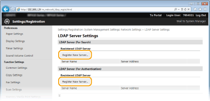 Click [Register New Server] for [LDAP Server (For Search)] or [LDAP Server (For Authentication)].