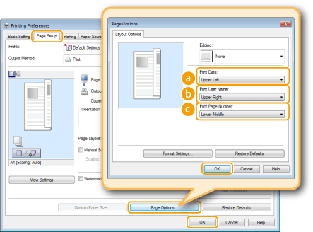 Select the print position of the print date, user name or page number
