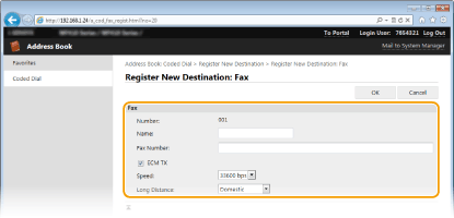 You can also specify [ECM TX] and [Speed] from <Fax Settings> ( Fax Settings (MF515x)) on the operation panel. However, settings made from <Address Book> are enabled for the detailed settings of destinations registered in the Address Book.
