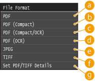 You can select the file format to which documents are scanned, from PDF/JPEG/TIFF. For PDF, you can select a highly compressed PDF file with a reduced file size or a text searchable PDF file prepared by OCR (Optical Character Recognition).