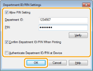 Select the check box to display the [Confirm Department ID/PIN] pop-up screen each time you print or fax from a computer. [Authenticate Department ID/PIN at Device]