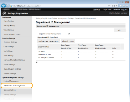 [Department ID Page Total]You can check the total numbers of pages copied, printed, scanned, or faxed for each Department ID.