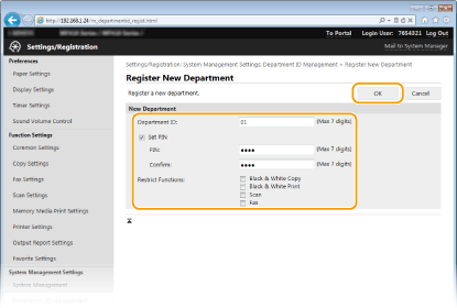 Enter a number of up to seven digits for the Department ID. [Set PIN]