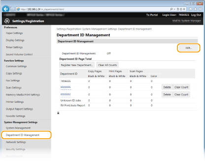 If you want to return the counts to zero, click the corresponding text link under [Department ID] and click [Clear Count]