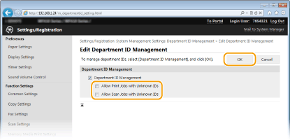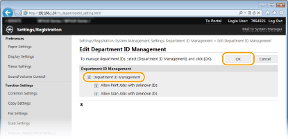 Click to verify that the correct ID and PIN are entered. This function is not available if the machine and the computer are connected via a USB or WSD (Web Services on Devices) port. [Confirm Department ID/PIN When Printing]/[Confirm Department ID/PIN When Sending Faxes]