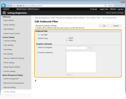 If MAC addresses are incorrectly entered, you may become unable to access the machine from the Remote UI, in which case you need to set <MAC Address Filter> to <Off>. MAC Address Filter