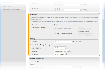 Specify the [Valid for] and [Authentication]/[Encryption]/[DH Group] settings.