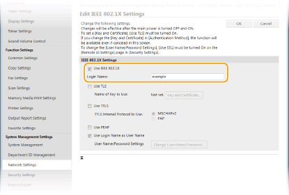 Using the operation panelYou can also enable or disable IEEE 802.1X authentication from <Menu> in the Home screen. IEEE 802.1X Settings