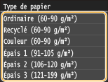Si l'écran illustré ci-dessus ne s'affiche pas lorsque le papier est chargéSi vous chargez toujours le même papier dans le bac multifonctions, vous pouvez ignorer les opérations de configuration du papier en définissant par défaut le format et le type de papier. Notez que si un paramètre par défaut est enregistré, l'écran illustré ci-dessus ne s'affiche pas. Pour afficher l'écran, sélectionnez <Spécifier lors du chargement du papier> (Enregistrement des paramètres papier par défaut du bac multifonctions).