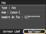 Si un écran apparaît et vous invite à saisir un code PIN, saisissez le code PIN qui convient à l'aide des touches numériques et appuyez sur <Appliquer>. Définition d'un code PIN pour le carnet d'adresses