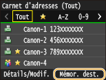Vous pouvez mémoriser les destinataires fréquemment utilisés sous forme de favoris dans le carnet d'adresses. Il est possible de modifier ou de supprimer les destinataires après leur enregistrement (Enregistrement de destinataires dans le carnet d'adresses depuis l'IU distante). La liste Favoris peut compter jusqu'à 19 destinataires.