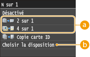 <Copie>  <N sur 1>  Sélectionnez <2 sur 1> ou <4 sur 1> Sélectionnez le format du document sur le <Format de lecture> Sur l'écran <Format de sortie>, sélectionnez l'alimentation papier contenant le papier à utiliser
