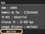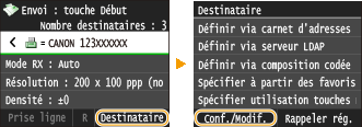 Mettre l'appareil hors tension ou régler <Limiter nouveaux destinataires> sur <Activé> a pour effet d'effacer les destinataires récents et de désactiver cette fonction. Restriction des destinataires disponibles