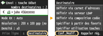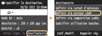 Si votre bureau dispose d'un serveur LDAP, vous pouvez définir un destinataire au moyen des informations utilisateur qui y sont stockées. Accédez au serveur LDAP à l'aide de l'appareil pour rechercher les informations utilisateur, puis définissez-les en tant que destinataires.