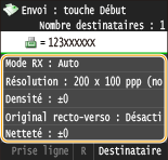 Vous pouvez enregistrer jusqu'à 18 combinaisons fréquemment utilisées de paramètres de fax. Vous pouvez rapidement afficher les paramètres enregistrés lorsque cela se révèle nécessaire, ce qui vous évite de procéder aux paramètres concernés à chaque fois, par exemple lorsque vous "numérisez un document recto verso et que vous l'envoyez à 5 destinataires et que vous procédez aux réglages de netteté". Vous pouvez également afficher les paramètres sous forme de boutons de raccourci sur l'écran Accueil.