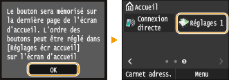 Si vous sélectionnez <Oui>, un message s'affiche. Consultez le message, puis appuyez sur <OK>. La combinaison de paramètres enregistrée s'ajoute à l'écran Accueil sous la forme d'un bouton de raccourci.