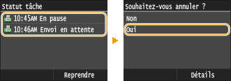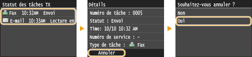 <Tâche TX>  <Statut tâche>  Sélectionnez le document sur l'écran <Statut des tâches TX>  <Annuler>  <Oui>