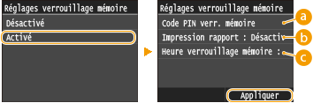 <Menu>  <Réglages fax>  <Réglages fonction RX>  <Réglages verrouillage de la mémoire>  <Activé> Spécifiez chaque réglage  <Appliquer>