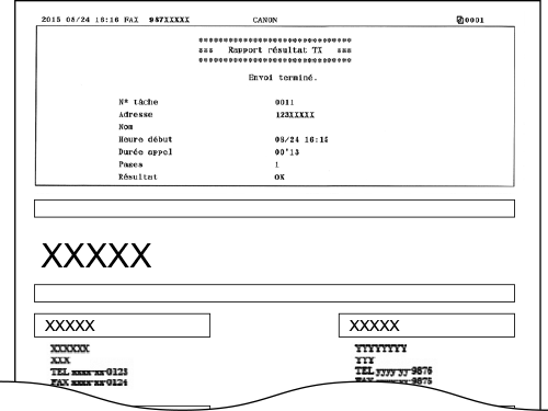 <Rapport résultat TX fax> ou <Rapport résultat TX e-mail/I-Fax/fichier>