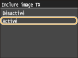 Lorsque vous sélectionnez <Activé> ou <Uniquement en cas d'erreur>, il est possible d'insérer une partie du fax dans le rapport. Réglez <Inclure image TX> sur <Activé>.