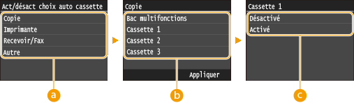 ). La sélection automatique de cassette est toujours activée pour l'impression sur du papier issu du bac multifonctions.