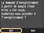 Vous pouvez également enregistrer l'appareil depuis un terminal mobile ou Google Chrome*. L'écran de l'appareil affiche le message de confirmation ci-après avant la fin de l'enregistrement. Appuyez sur <Oui> pour terminer l'enregistrement.