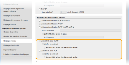 Utilisez l'interface distante pour définir les paramètres détaillés d'envoi et de réception, notamment les paramètres d'utilisation de l'appareil pour l'envoi et la réception des I-Fax et les paramètres d'authentification POP ainsi que le cryptage avant tout envoi d'e-mails ou d'I-Fax. Contactez votre fournisseur ou votre administrateur réseau pour les paramètres requis.
