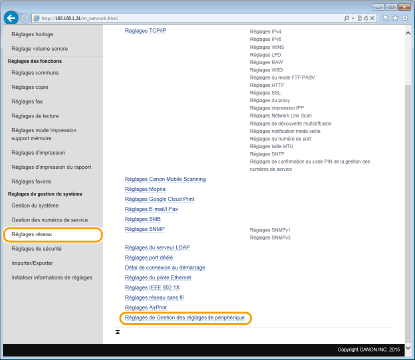 Utilisez des plug-ins iW Management ConsoleVous devez activer les paramètres du port dédié et les paramètres SNMP. Pour les paramètres SNMP, définissez [Autorisation accès MIB] sur [Lecture/Écriture] (SNMPv1 et SNMPv3).