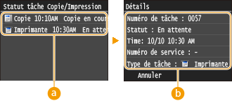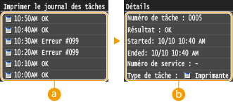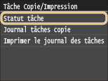Si <Afficher le journal des tâches> est défini sur <Désactivé>, vous ne pouvez pas consulter le journal des tâches d'impression. Afficher le journal des tâches