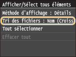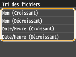 Vous pouvez définir un réglage de tri tel que <Nom (Croissant)> ou <Date/Heure (Croissant)> comme réglage par défaut permettant de trier les fichiers. Réglages par défaut de tri des fichiers