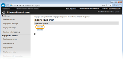Chargez (importez) les données exportées depuis l'appareil. Vous pouvez également importer les données de paramétrage d'un autre appareil, sous réserve qu'il soit du même modèle que le vôtre.