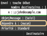 L'adresse de réponse n'est pas définie par défaut. Si vous voulez afficher une autre adresse que celle qui figure sur l'appareil, choisissez-en une parmi les adresses enregistrées dans le carnet d'adresses. En l'absence de destinataires dans ce dernier, consultez la section Enregistrement dans le carnet d'adresses.