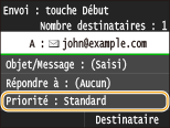 Indiquez l'objet, l'adresse de réponse et la priorité de l'e-mail.