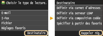 Vous pouvez sélectionner un destinataire parmi les trois derniers destinataires. Lorsque vous définissez un destinataire précédemment utilisé, l'appareil réutilise les paramètres de numérisation, par exemple la densité, employés lors de l'envoi des documents à ce destinataire.
