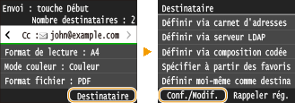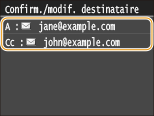 Mettre l'appareil hors tension ou régler <Limiter nouveaux destinataires> sur <Activé> a pour effet d'effacer les destinataires récents et de désactiver cette fonction. Restriction des destinataires disponibles