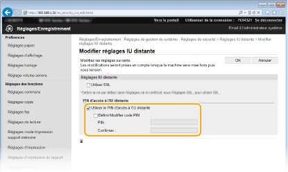 Cochez la case [Utiliser le PIN d'accès à l'IU distante] et configurez le code PIN.