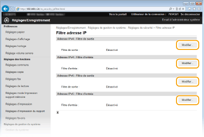 En cas de saisie incorrecte des adresses IP, vous risquez de ne pas pouvoir accéder à l'appareil depuis l'IU distante. Dans ce cas, vous devez définir <Filtre d'adresse IPv4> ou <Filtre d'adresse IPv6> sur <Désactivé>. Filtre d'adresse IPv4Filtre d'adresse IPv6