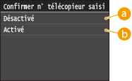 Vous pouvez configurer l'appareil pour obliger les utilisateurs à saisir à deux reprises le numéro de fax lorsque ce dernier est spécifié au moyen des touches numériques. Cela évite les risques d'erreur.