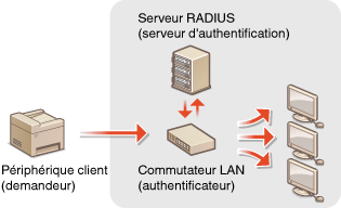 IEEE 802.1X est une norme et un mécanisme permettant de bloquer un accès intrusif au réseau en gérant collectivement les informations d'authentification des utilisateurs. Lorsqu'un périphérique essaie de se connecter au réseau 802.1X, il est tenu de s'identifier pour s'assurer que la connexion est établie par un utilisateur autorisé. Les informations d'authentification sont transmises à un serveur RADIUS pour vérification, lequel se charge d'accepter ou de refuser la communication avec le réseau selon les résultats de l'authentification. En cas d'échec de l'authentification, un commutateur LAN (ou point d'accès réseau) bloque l'accès depuis l'extérieur du réseau. L'appareil peut se connecter à un réseau 802.1X en tant que périphérique client.