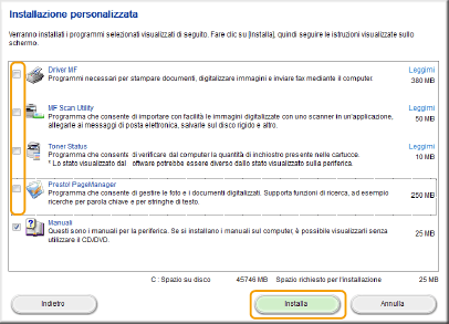 Deselezionare tutte le caselle di controllo tranne [Manuali], quindi fare clic su [Installa].