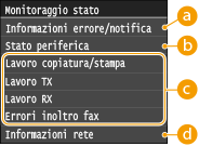 , viene visualizzata una schermata che consente di controllare lo stato di avanzamento dei documenti in corso di stampa, invio o ricezione, oltre allo stato della macchina (quantità di toner rimanente nella cartuccia, ecc.) e le impostazione di rete, come l'indirizzo IP della macchina.