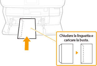 In questa sezione viene descritto come caricare le buste con l'orientamento preferito, oltre alle procedure necessarie da eseguire prima di caricare le buste. Per una descrizione della procedura generale di caricamento buste nel vassoio multiuso, vedere Caricamento della carta nel vassoio multiuso.